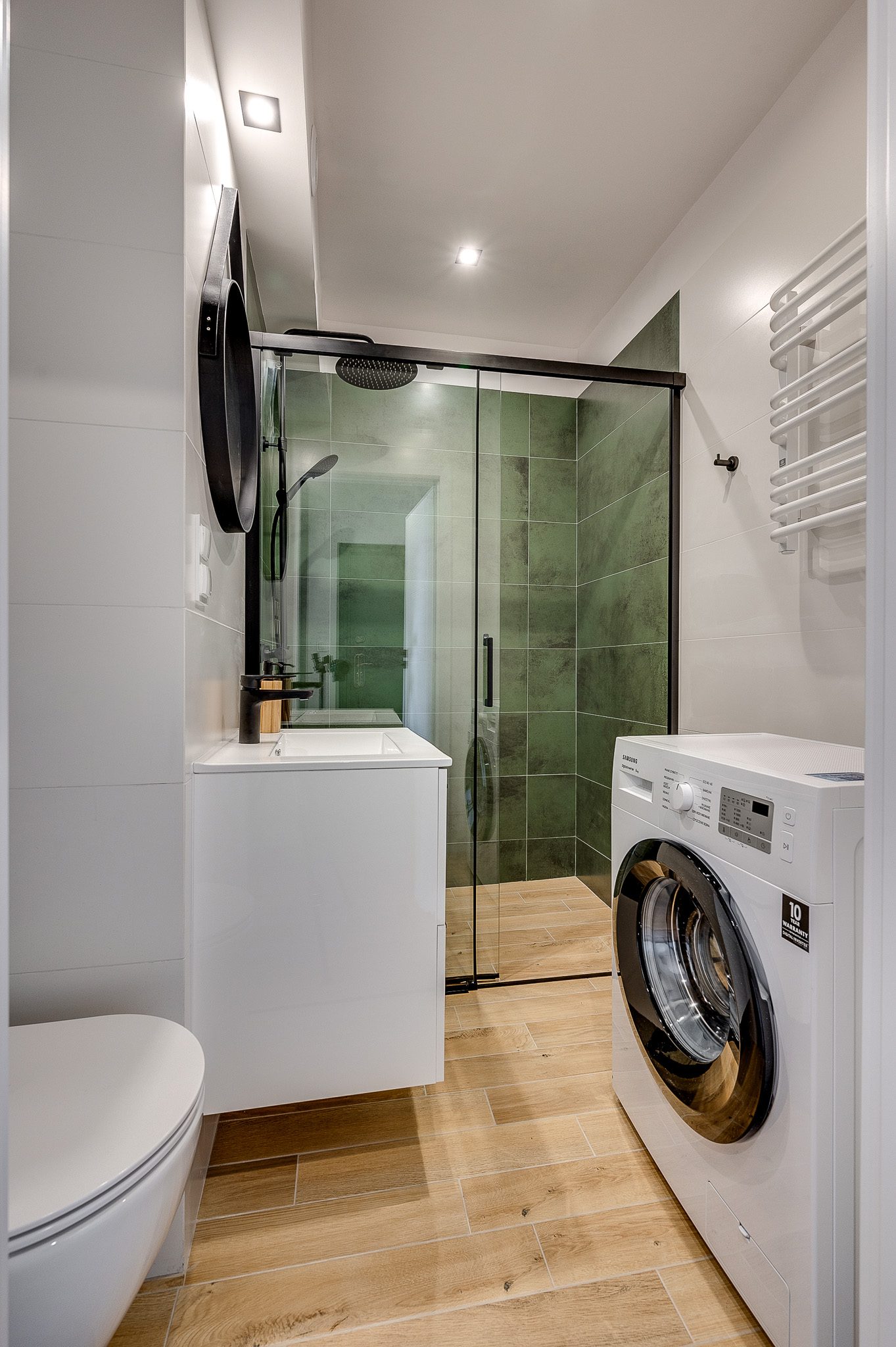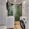 -łazienka z WC:kabina prysznicowa, toaleta, umywalka z baterią, pralka, płytki gresowe