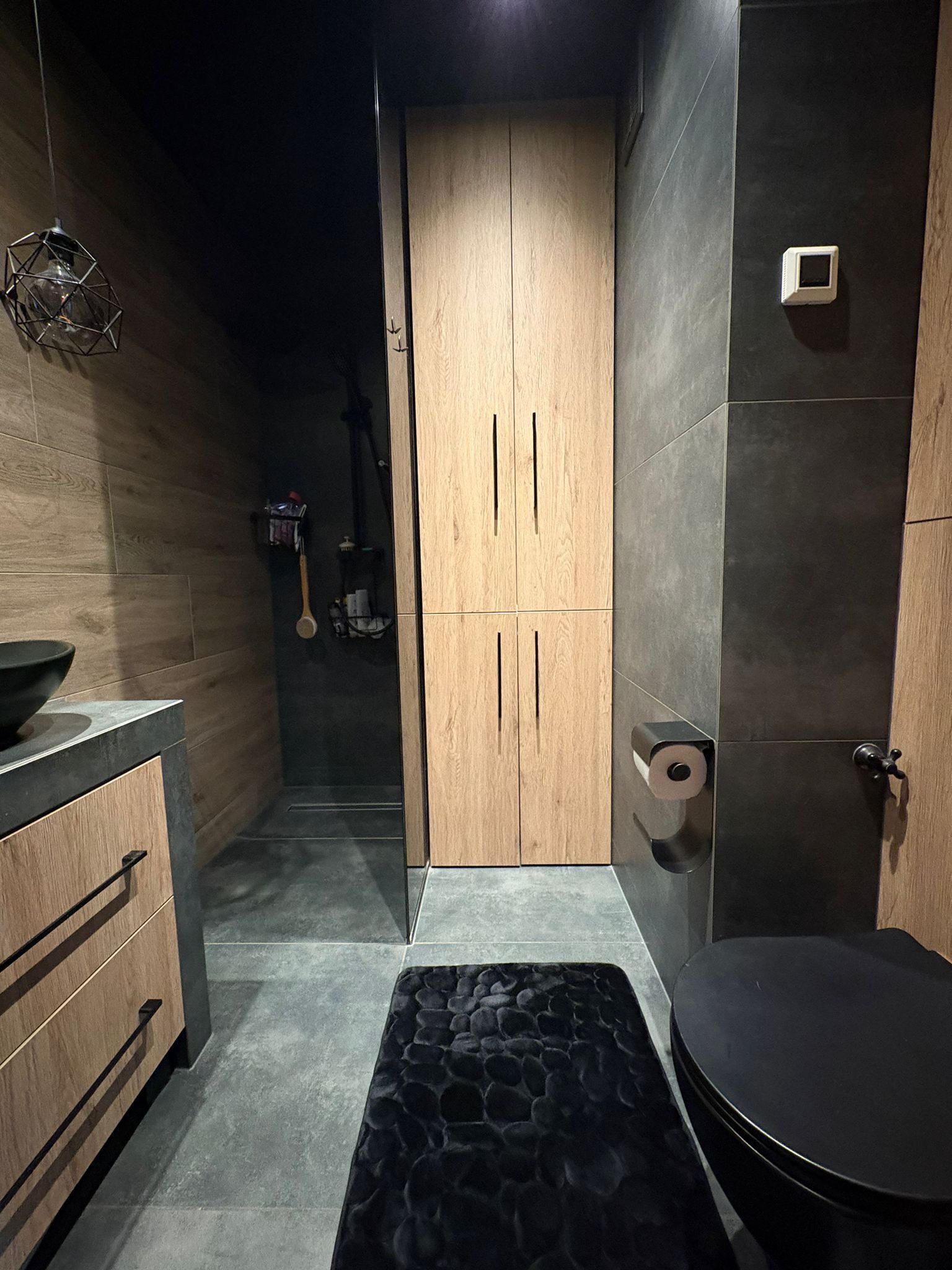 łazienka z WC–  pomieszczenie wykonane w stylu nowoczesnym,meble pod wymiar,ogrzewanie podłogowe