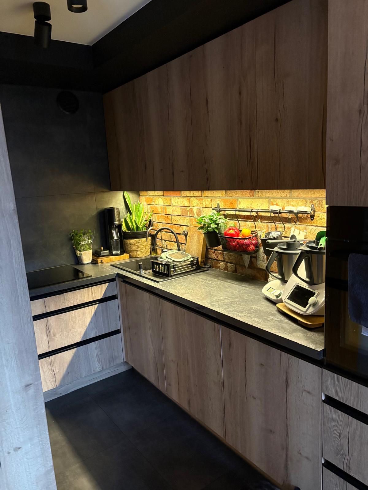 kuchnia– połączona z salonem oraz strefą jadalnianą, umeblowana wraz z pełnym wyposażeniem sprzęt AGD.